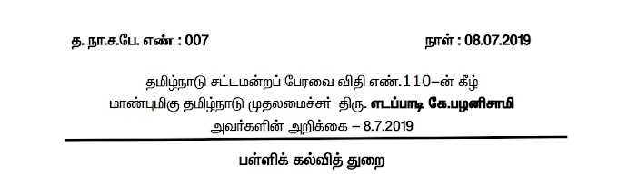 Flash News : பள்ளிக் கல்வித்துறைக்கு சட்டமன்றப் பேரவை விதி எண். 110-ன் கீழ் முதலமைச்சர் அறிவிப்பு அறிக்கை வெளியீடு. நாள் :08.07.2019 0 Comments பள்ளிக் கல்வித்துறைக்கு சட்டமன்றப் பேரவை விதி எண். 110-ன் கீழ் முதலமைச்சர் அறிவிப்பு அறிக்கை வெளியீடு. நாள் :08.07.2019 Click here - School Education CM Announcement ... Join Whats App Group Link -Click Here Join Telegram Group Link -Click Here