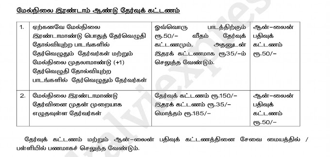 கடந்தாண்டுகளில் நேரடித் தனித்தேர்வராக மேல்நிலை முதலாமாண்டு (11) தேர்வெழுதி தேர்ச்சி பெறாத தேர்வர்கள் அனைவரும், தற்போது மேல்நிலை இரண்டாமாண்டு (12) பொதுத்தேர்வெழுதுவதற்கும், முதலாமாண்டு (11) தேர்வில் தேர்ச்சி பெறாத பாடங்களை மீண்டும் எழுதுவதற்கும் சேர்த்து விண்ணப்பிக்கலாம்.