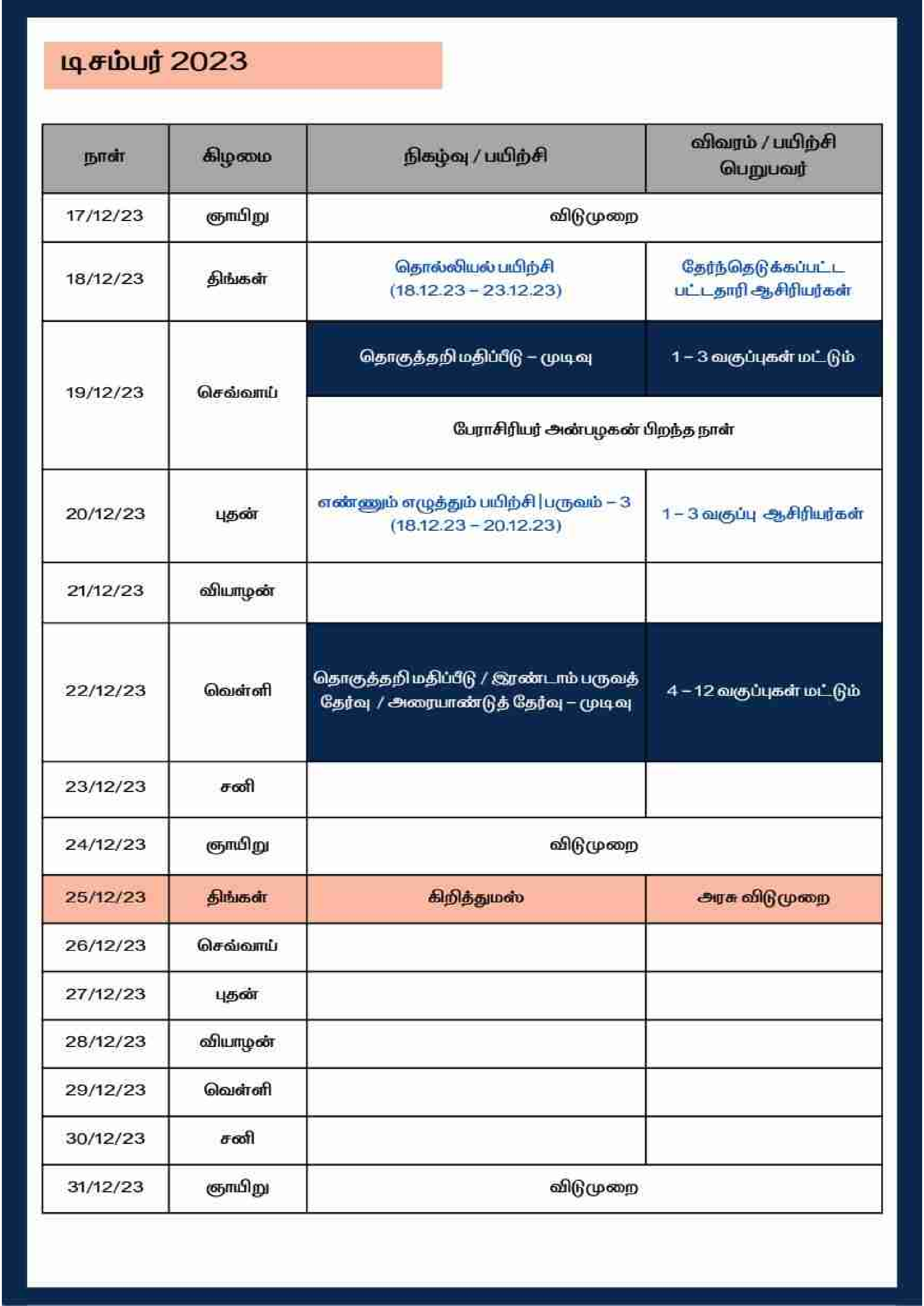School Calendar December 2023|டிசம்பர் -2023 நாள்காட்டி.